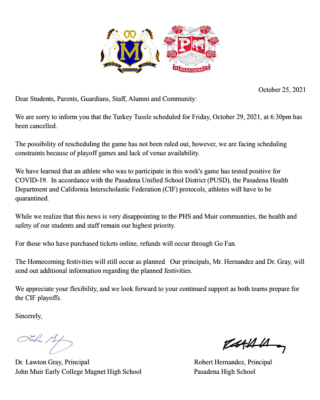 El juego Turkey Tussle del viernes entre las escuelas secundarias John Muir y Pasadena ha sido cancelado debido a una contracción de COVID-19.