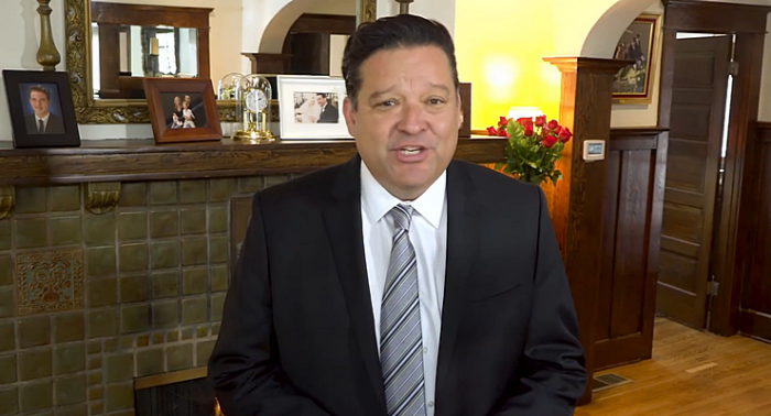 El alcalde de Pasadena, Víctor Gordo, pronuncia virtualmente el discurso sobre el estado de la ciudad de 2021 desde su casa. (Captura de pantalla a través de Pasadena Media)