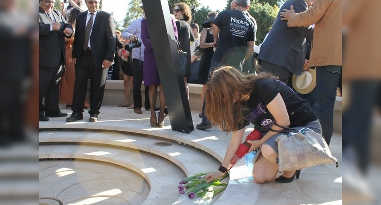 Una joven pone el primer ramo de recuerdo en el Memorial del Genocidio Armenio de Pasadena después de su presentación el 18 de abril de 2015 en Old Pasadena. Foto de James Macpherson.