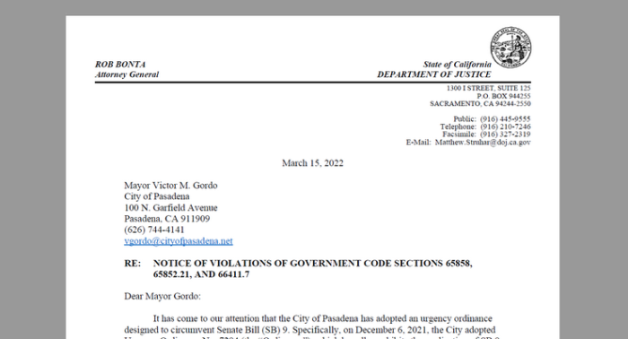 En la carta, el procurador general Bonta advierte a Pasadena que su esfuerzo por eludir la SB 9 y restringir la producción de viviendas viola la ley.