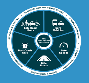 “El enfoque de sistema seguro tiene como objetivo eliminar las lesiones fatales y graves para todos los usuarios de la carretera. Lo hace a través de una visión holística del sistema vial total que, en primer lugar, anticipa los errores humanos y, en segundo lugar, mantiene la energía del impacto en el cuerpo humano en niveles tolerables”.