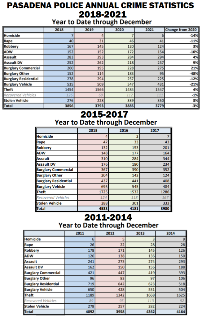 Las estadísticas del Departamento muestran que los agentes registraron 3779 delitos en Pasadena el año pasado, lo que representa una reducción de solo un 2,7 % con respecto a 2020, pero un 13,3 % menos que el año con mayor cantidad de delitos de la década, 2013.