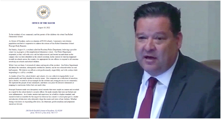 En un comunicado emitido el jueves por la tarde, el alcalde Víctor Gordo dijo que era difícil aceptar la disculpa del director de una escuela primaria unificada de Pasadena por el lenguaje ofensivo que usó después de que la policía esposara y detuviera brevemente a un conserje que trabajaba durante mucho tiempo en la escuela primaria San Rafael el fin de semana pasado.