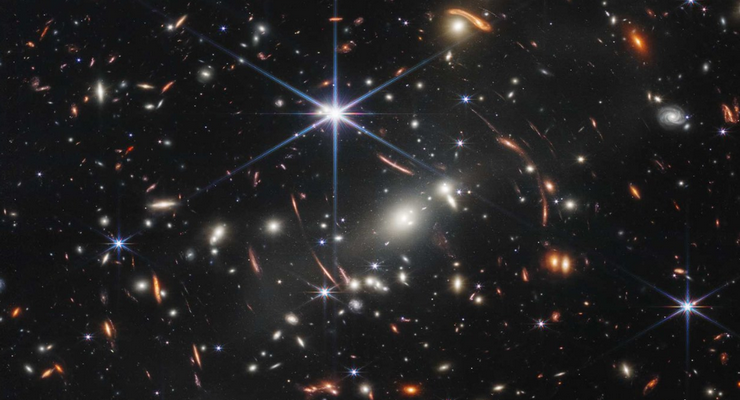 Esta imagen, la primera publicada por el telescopio espacial James Webb de la NASA, muestra el cúmulo de galaxias SMACS 0723. Algunas de las galaxias aparecen manchadas o estiradas debido a un fenómeno llamado lente gravitacional. Este efecto puede ayudar a los científicos a mapear la presencia de materia oscura en el universo. [Crédito: NASA, ESA, CSA, STScI]