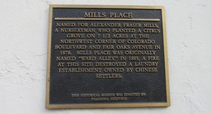 “El nombre de Alexander Fraser Mills, un vivero que plantó un huerto de cítricos en 7 ½ acres en la esquina noroeste de Colorado Boulevard y Fair Oaks Avenue en 1878”, dice la placa. “Mills Place originalmente se llamaba Ward Alley en 1885. Un incendio en este sitio destruyó una lavandería propiedad de colonos chinos”.
