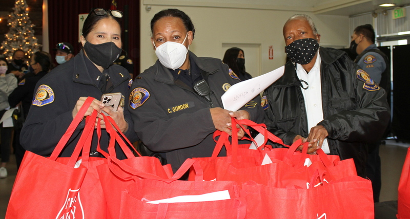 El equipo de la policía de Pasadena con el Ejército de Salvación entregará comidas calientes de Acción de Gracias a los confinados en casa. Jueves .25.2021 [Foto de James Mcpherson / PasadenaNow]