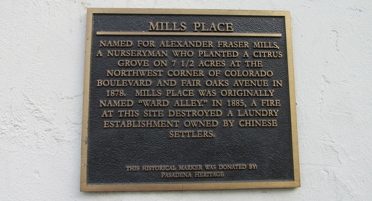 “Nombrado así por Alexander Fraser Mills, un viverista que plantó una arboleda de cítricos en 7 ½ acres en la esquina noroeste de Colorado Boulevard y Fair Oaks Avenue en 1878. Mills Place se llamó originalmente Ward Alley en 1885. Un incendio en este sitio destruyó una lavandería propiedad de colonos chinos”, dice ahora la placa.