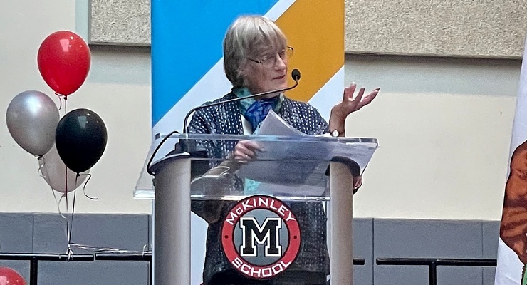 La Dra. Elizabeth Pomeroy, presidenta de la Junta Escolar del PUSD, mientras pronunciaba el discurso sobre el estado de la escuela de 2022 el 17 de mayo de 2022. [Eddie Rivera/Pasadena Now]