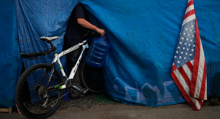 Una bandera estadounidense descolorida cuelga afuera de una carpa montada en el sendero del río Santa Ana mientras una persona sin hogar entra a la carpa en Anaheim el 22 de enero de 2018. Foto de Jae C. Hong, AP Photo