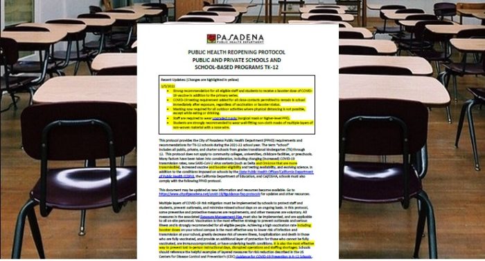 Pasadena dio a conocer el miércoles protocolos de salud para la reapertura de escuelas públicas y privadas después de las vacaciones. El documento de 18 páginas contiene docenas de procedimientos nuevos y revisados que las escuelas deben seguir, impulsados por el aumento de Omicron.