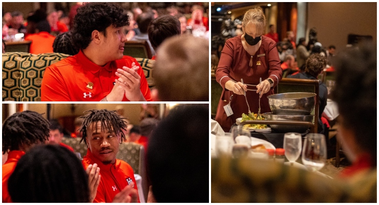 El jueves por la noche, los jugadores del equipo de fútbol de Utah con sus entrenadores y personal llegaron a Lawry’s Prime Rib para recibir una bienvenida con alfombra roja, con el personal de servicio de Lawry alineado afuera para acompañarlos.