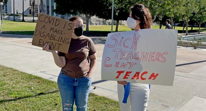 La Asociación de Docentes les dijo a sus miembros que todos los Docentes que estén preocupados por su salud y seguridad debido al aumento actual de COVID en el condado de Los Ángeles deben informar al Distrito de su convicción de que, por razones de seguridad, deben continuar impartiendo sus cursos de forma remota, fuera del campus. , durante sus días y horarios previstos.
