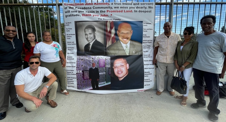 La pancarta, que fue pagada por más de una docena de miembros de la comunidad, decía: “Concejal John Kennedy, un verdadero amigo y servidor de la comunidad de Pasadena, lo extrañamos mucho. Nos volveremos a ver en la Tierra Prometida. Con profunda gratitud, gracias, John”.