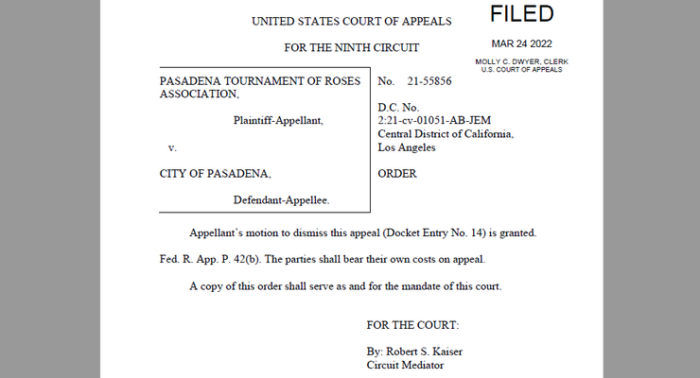 El capítulo final de la demanda del Torneo de las Rosas de 2021 contra la Ciudad por el Juego del Rose Bowl llegó a su fin el viernes después de que un mediador del Noveno Circuito accedió a la solicitud del Torneo de desestimar su apelación del resultado.