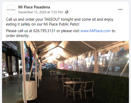 Al menos un restaurante ha promocionado su patio sin servicio a través de las redes sociales a mediados de diciembre, instando a los clientes a “pedir tu comida para llevar esta noche y venir a sentarse y disfrutar de comer de forma segura …”