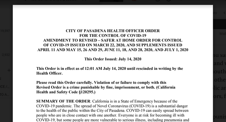 Dado que Pasadena tiene su propio departamento de salud, todas las órdenes estatales de CDPH se interpretan y luego se vuelven a emitir como órdenes locales, según las condiciones aplicables.